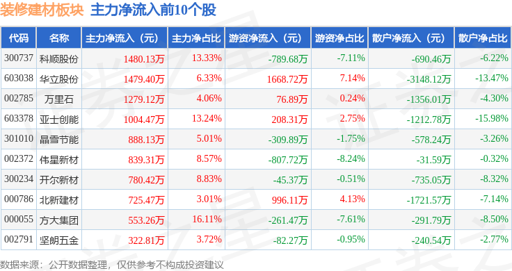 拆建筑材板块个股资金流向见下表: